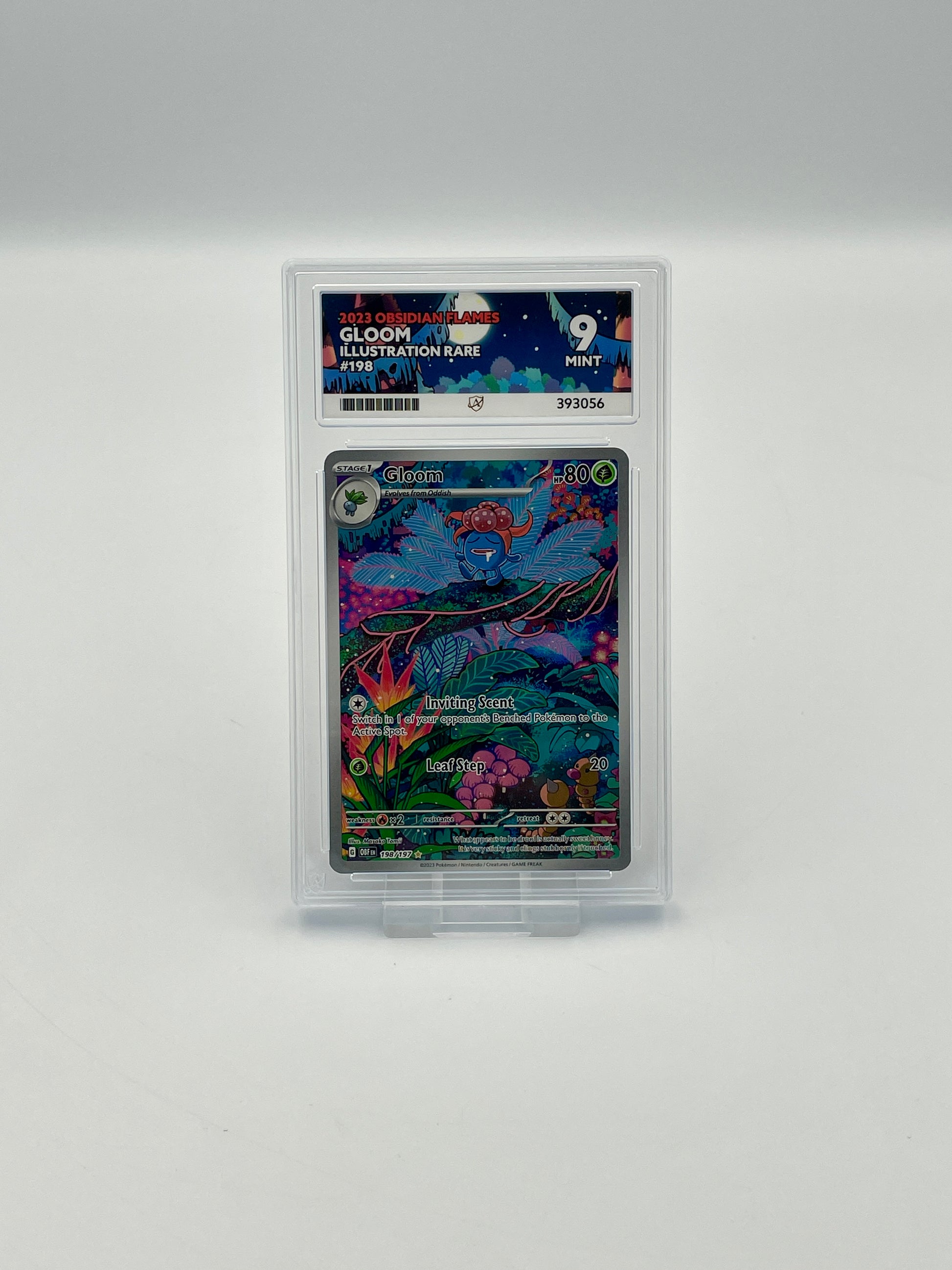 This Ace Graded Gloom #198 from the Obsidian Flames set features the stunning Illustration Rare artwork, showcasing the Pokémon in a vibrant, detailed scene. A unique collectible for fans of Generation I, this version of Gloom adds a special twist to your collection with its alternate art style. Ace Grading has awarded this card a strong 9 Mint, making it ideal for collectors looking for a high-quality slabbed card from one of the more visually captivating modern sets.