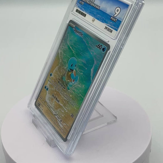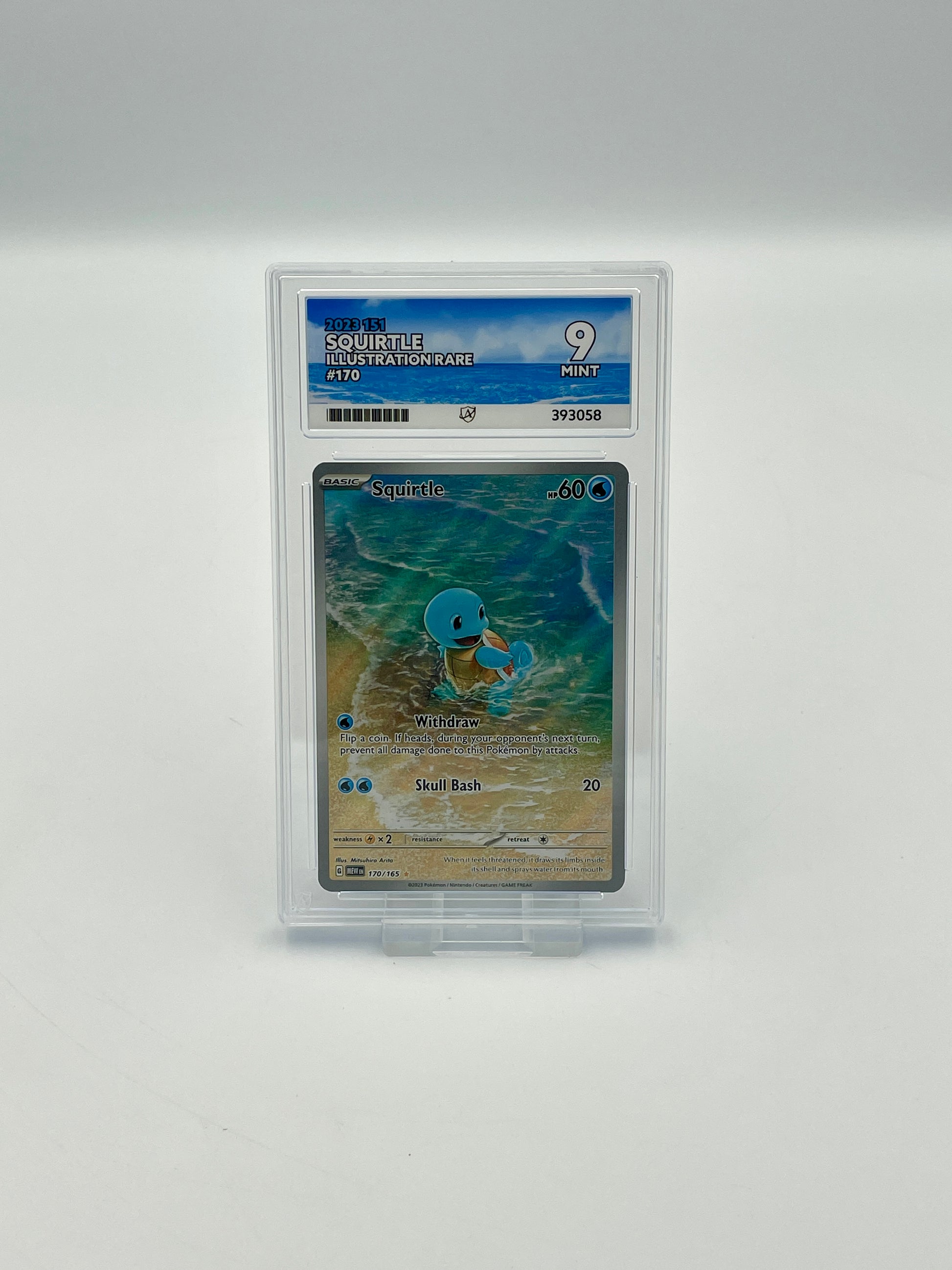 This is the Illustration Rare Squirtle #170 from the iconic 151 set, graded Mint 9 by Ace Grading. Featuring Squirtle in a playful hand-drawn art style, this card captures everything fans love about Kanto's original water starter. The 151 set has become one of the most collected Pokémon TCG sets in recent years, and this Illustration Rare is one of the most desirable cards for nostalgia-driven collectors.